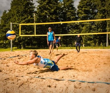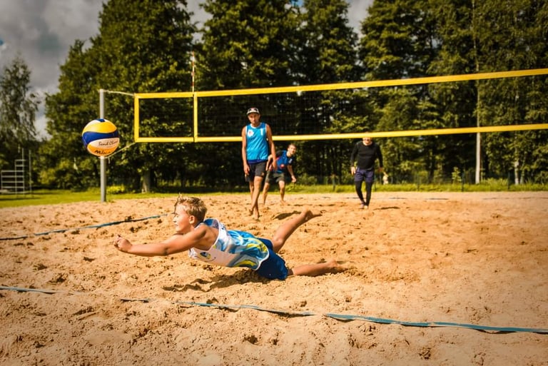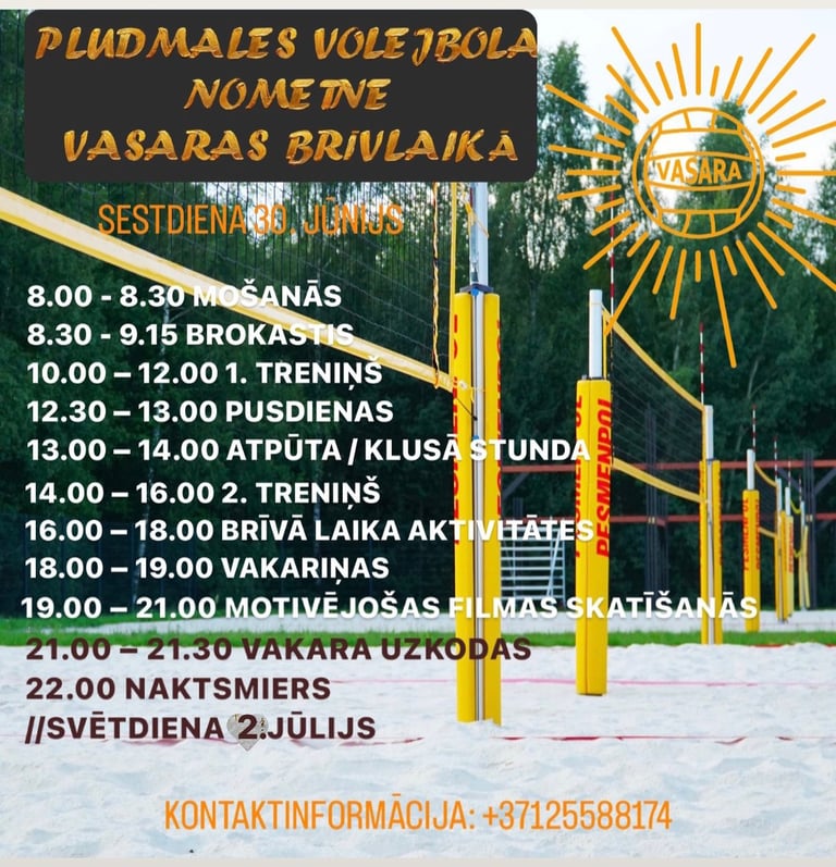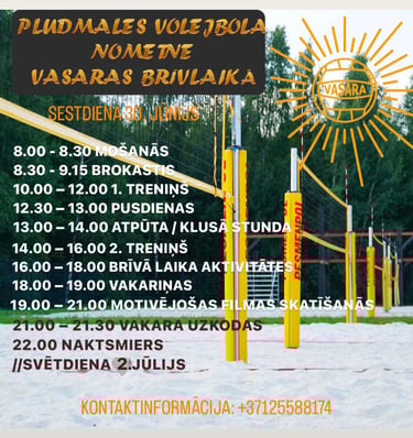 Kopā ar pieredzējušiem pludmales volejbola treneriem attīstīsim tehnisko, fizisko un taktisko meistarību pludmales volejbolā uz 4 āra laukumiem un 2 laukumiem iekšā hallē, ja gadījumā būs slikti laika apstākļi.